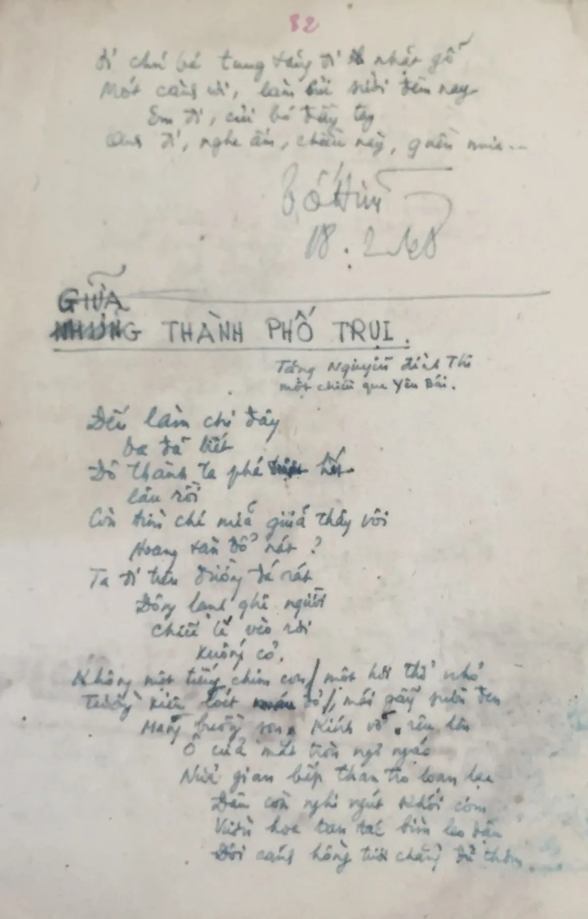 Bản thảo bài thơ “Thành phố trụi” Tố Hữu viết tặng Nguyễn Đình Thi trong một chiều dừng chân ở Yên Bái, 1948